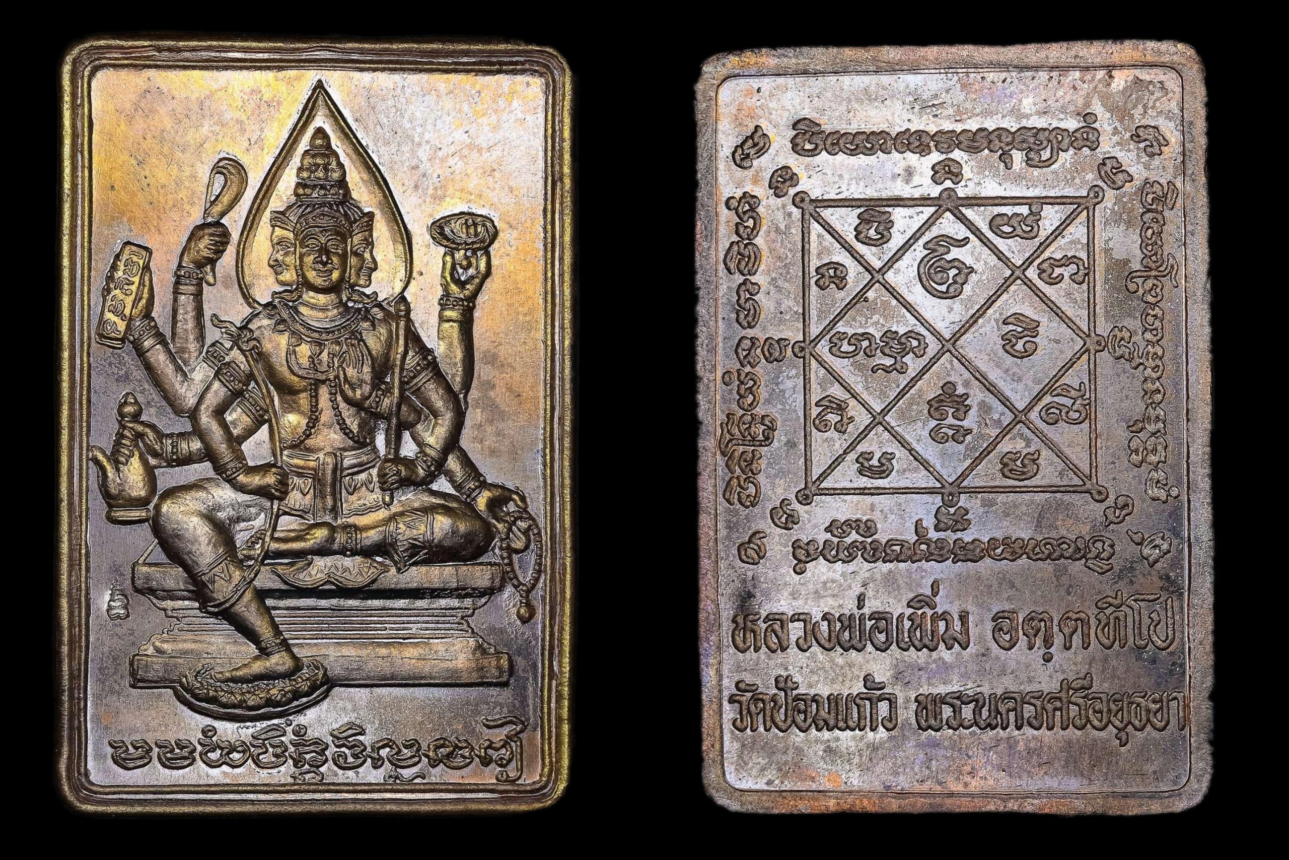 第一期四面神铜牌,龙婆碰瓦蹦轿佛寺,佛历2544(2001年)。这尊是九宝铜材质,流行模版本,只制造588尊而已。佛牌的高度大约是4.2CM。