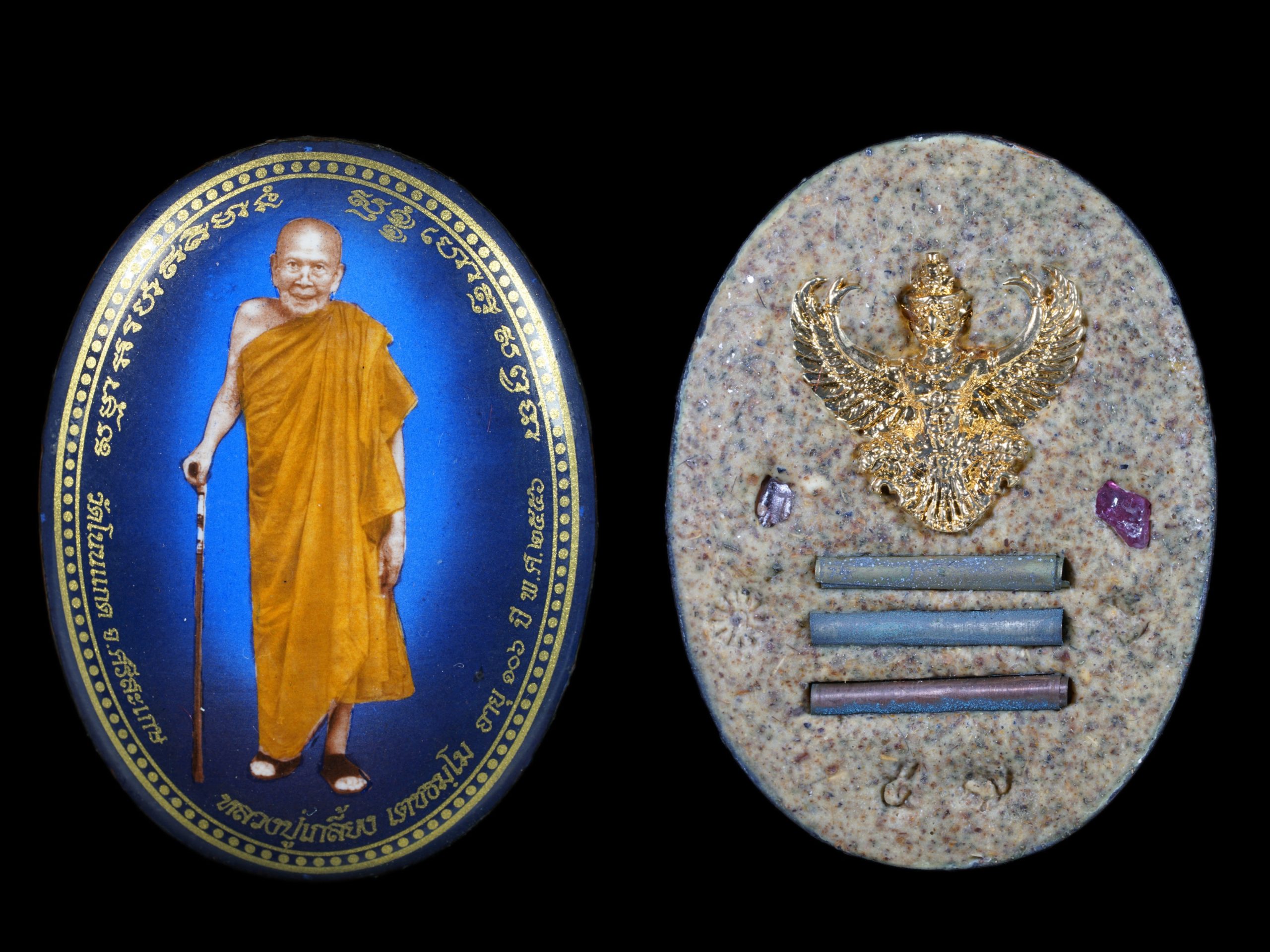 Locket Visakha Bucha Maha Barami Luang Phor Kliang TechaThamMo Wat Non Kead BE2556. The back inserted with Garuda Maha Amnaj, 3 Takruts and Gems. Serial Number 57.