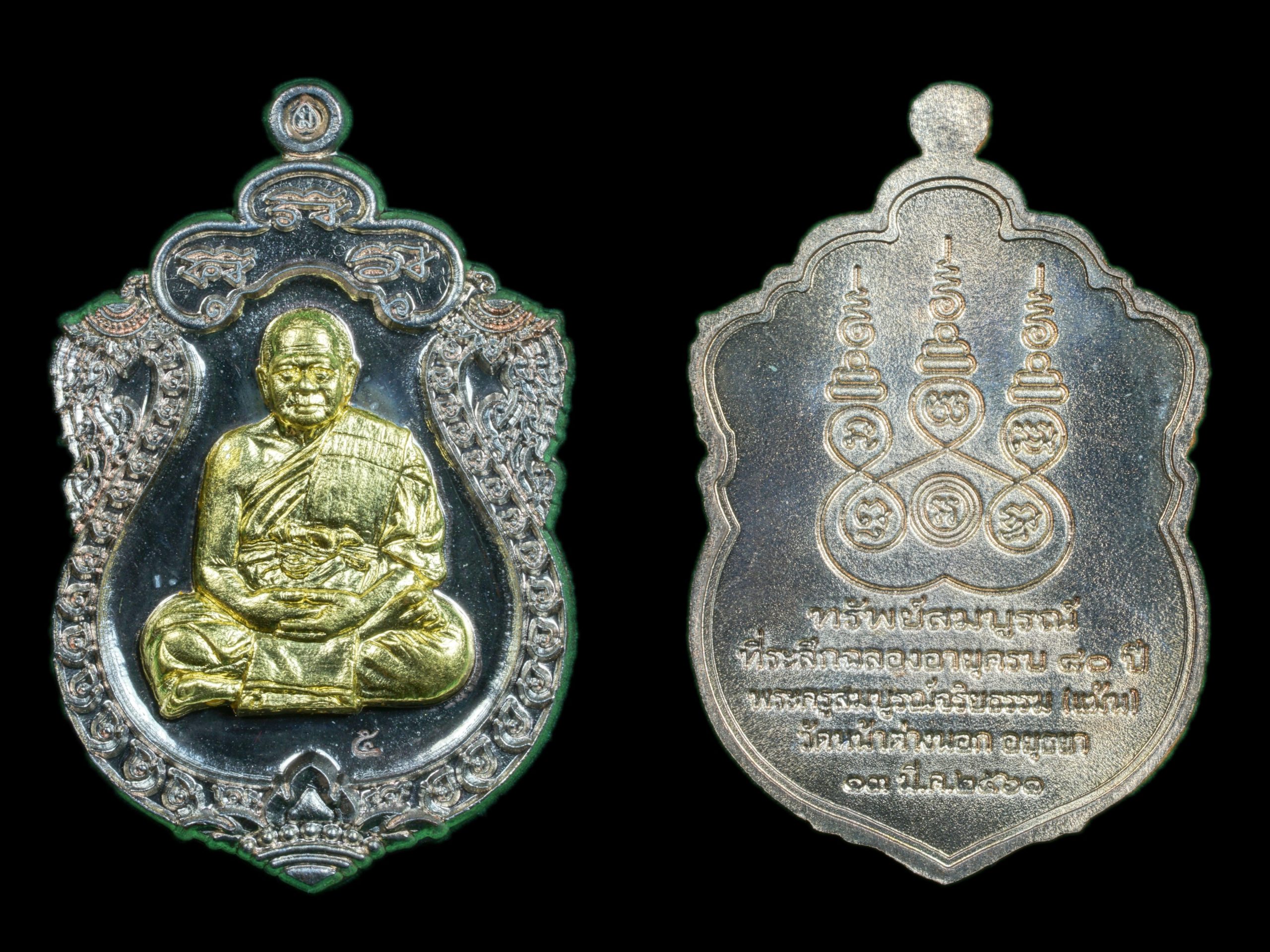 伦Sap Somboon自身铜牌,龙婆棉瓦纳汤落佛寺,佛历2561(2018年)。这尊是九宝铜盖金材质,只制作了50尊而已。佛牌编号5。连同寺庙盒子。佛牌的高度大约是3.8CM。于2018年2月25日举行加持大法会。这批佛牌是为了建造一座227寸脚的龙婆钟大金身,以及庆祝龙婆棉80岁生日。